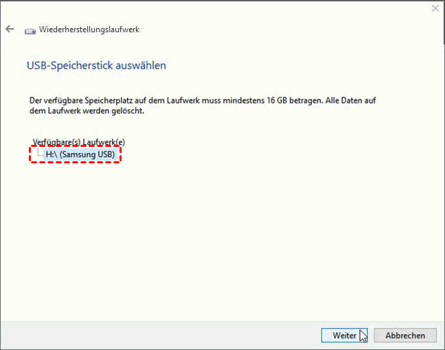 3. Wählen Sie den USB-Stick aus, den Sie vorbereitet haben, und klicken Sie auf „Weiter", um fortzufahren.