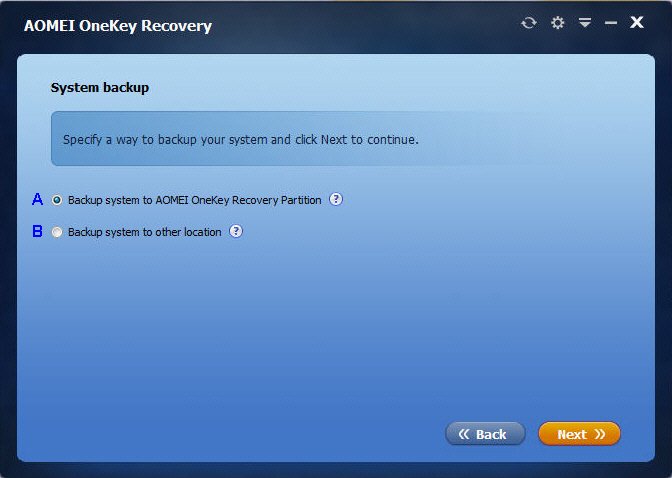 • Möglichkeit A: Backup des Systems auf AOMEI OneKey Recovery Partition - Die Image-Datei der Systemsicherung wird auf dem Systemlaufwerk gespeichert. Es erfordert, dass das Systemlaufwerk genügend freien Speicherplatz hat, um sie zu speichern.