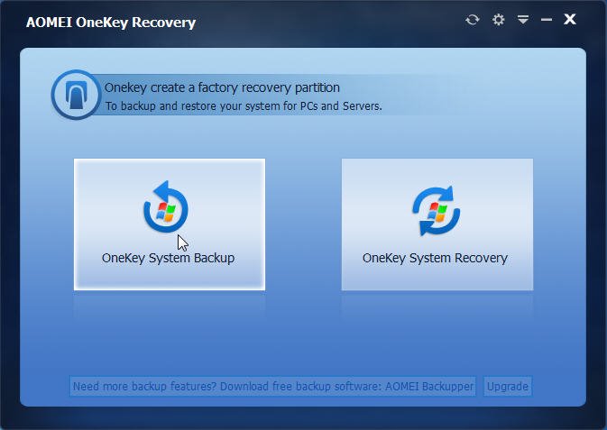 AOMEI OneKey Recovery ist eine sichere und einfach zu bedienende Software zur Sicherung und Wiederherstellung Ihres Systems, die alle Windows PC-Betriebssysteme wie Windows 8.1, Windows 8, Windows 7, Windows Vista und Windows XP unterstützt. Sie können sie verwenden, um die Systempartition im Falle eines Systemfehlers auf ihren ursprünglichen Status zurückzusetzen. Sie können auch eine Systemstatussicherung für eine einfache Wiederherstellung nach Bedarf erstellen. Die Schnittstelle von AOMEI OneKey Recovery ist sehr einfach, nur spiegeln, dass es einfach zu bedienen ist.