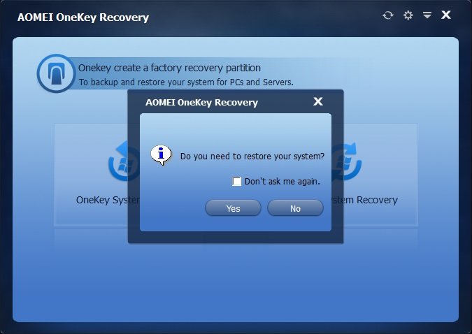 Schritt 1. Wenn die Windows PE-Wiederherstellungsumgebung gestartet wird, wird automatisch eine AOMEI OneKey Recovery angezeigt. Klicken Sie auf „Yes", um zu bestätigen. Und dann wählen Sie „OneKey System Recovery", um Ihr System wiederherzustellen.
