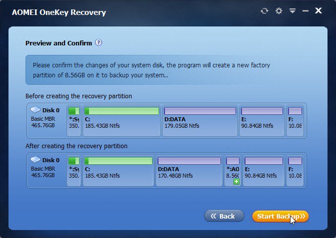 In diesem Fenster zeigt Ihnen das Programm die Änderungen vor und nach der Erstellung von werkseitiger Wiederherstellungspartition, die mit „+" gekennzeichnet ist. Um die Beschädigung zu verhindern, wird ihm keinen Laufwerksbuchstaben zugewiesen, d.h, es wird standardmäßig als versteckte Partition erstellt. Um die Änderungen zu bestätigen, klicken Sie bitte auf „Start Backup", um fortzufahren.