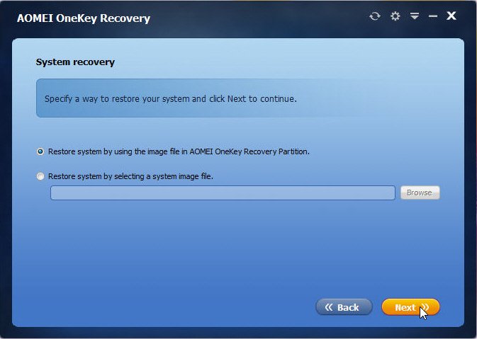 Klicken Sie auf „Browse", um die Image-Date der Systemsicherung zu finden. Klicken Sie auf „Next", um fortzufahren.