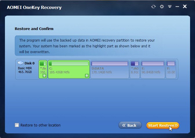 • Die andere Wahl: Wenn Sie andere Festplatte(n) in Ihrem Computer haben und Sie Ihr System nicht an den ursprünglichen Standort wiederherstellen möchten, kreuzen Sie bitte das Kontrollkästchen vor „Restore to other location" an. Und dann klicken Sie auf „Next", um fortzufahren. Sie müssen einen Speicherort auswählen, der ein nicht zugewiesener Speicherplatz oder eine Partition sein kann (Hinweis: Wenn Sie einen Partiton auswählen, werden die Daten darauf überschrieben). Und dann klicken Sie auf „Start Restore".