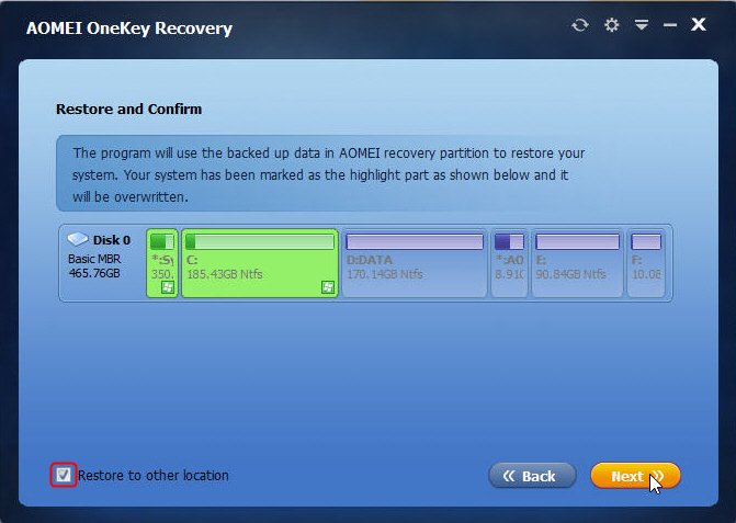• Die andere Wahl: Wenn Sie andere Festplatte(n) in Ihrem Computer haben und Sie Ihr System nicht an den ursprünglichen Standort wiederherstellen möchten, kreuzen Sie bitte das Kontrollkästchen vor "Restore to other location" an. Und dann klicken Sie auf "Next", um fortzufahren. Sie müssen einen Speicherort auswählen, der ein nicht zugewiesener Speicherplatz oder eine Partition sein kann (Hinweis: Wenn Sie einen Partiton auswählen, werden die Daten darauf überschrieben). Und dann klicken Sie auf "Start Restore".