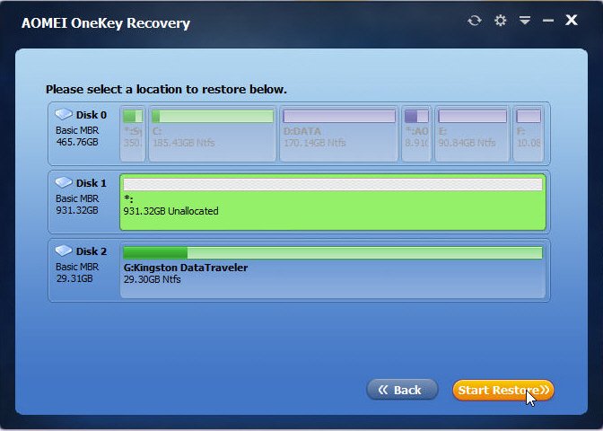 • Eine Wahl: Es gibt keine andere Festplatte in Ihrem Computer. In diesem Fall können Sie sich nur an den ursprünglichen Speicherort wiederherstellen. Bitte klicken Sie auf „Start Restore", wenn Sie die Änderungen bestätigen.