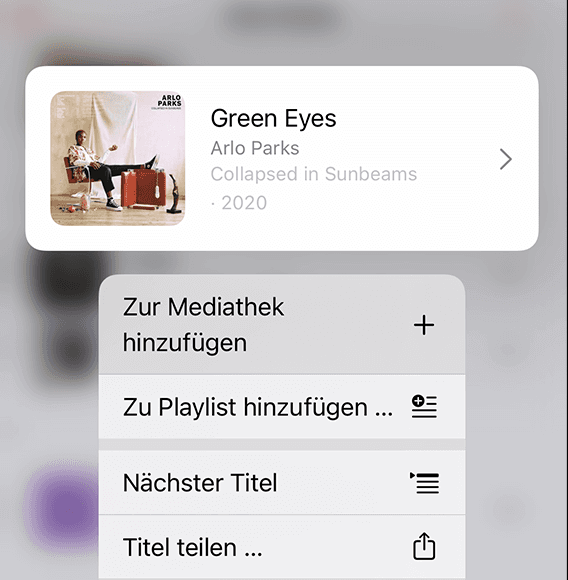 Schritt 1. Überprüfen Sie, ob Sie den Titel zu Ihrer Bibliothek hinzugefügt haben. Wenn nicht, tippen Sie auf einen Titel, eine Wiedergabeliste oder ein Album und klicken auf das Symbol +, um einen einzelnen Titel hinzuzufügen, oder tippen auf das Symbol Zur Mediathek hinzufügen, um ein ganzes Album oder eine Wiedergabeliste hinzuzufügen.