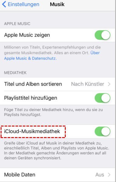 ※ Hinweis: Sie müssen die Synchronisationsbibliothek aktivieren, um Musik von Apple Music in Ihre Bibliothek zu laden. Gehen Sie zu: Einstellungen > Musik, dann aktivieren Sie iCloud-Musikmediathek.
