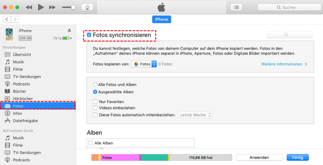 ● Es können nur alle Fotos synchronisiert werden (Wenn Sie auf einmal nur die bestimmten Fotos senden, verwenden Sie am besten FoneBackup).
