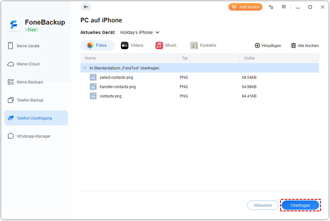 Und egal, ob Sie alle oder nur ausgewählte Fotos übertragen wollen, FoneBackup ist der beste Helfer. Es ist eine iPhone-zu-PC-Übertragungssoftware, die Ihnen hilft, iPhone-Fotos zu speichern und Fotos von iPhone zu iPad ohne iCloud/iTunes/AirDrop zu übertragen. Es kann Ihnen helfen, Ihre schönen Bilder immer an der richtigen Stelle zu platzieren und Fotos zwischen iPhone, iPad und Computer zu verschieben.