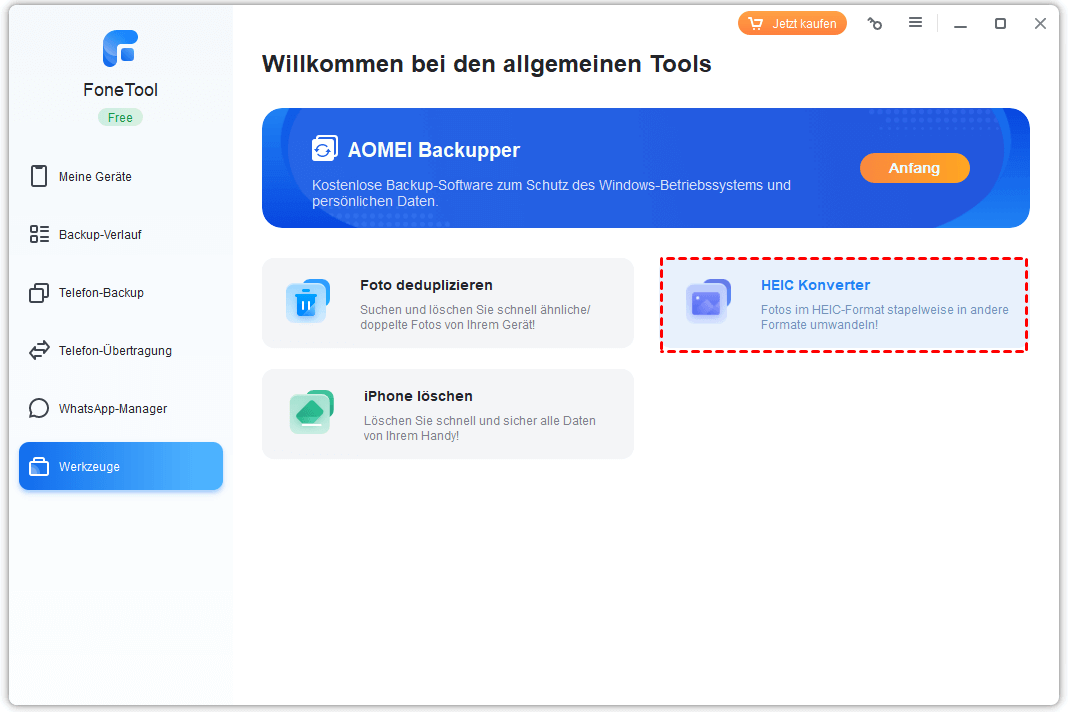 Schritt 1. Installieren und starten Sie FoneTool > Klicken Sie unter Werkzeuge auf HEIC Konverter.