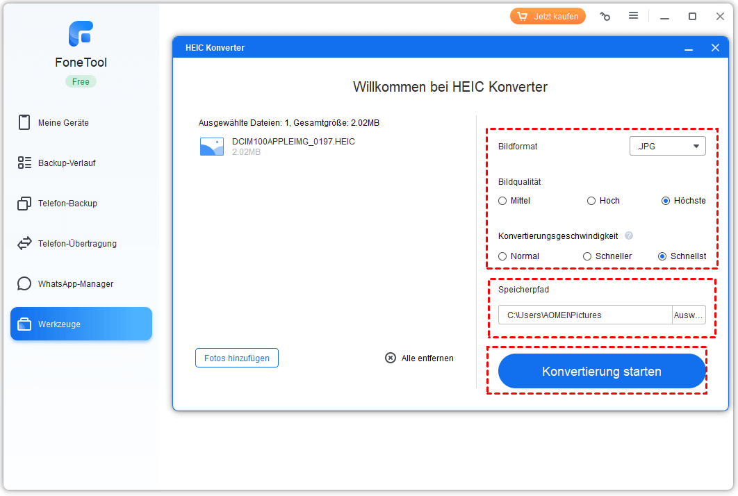 Wollen Sie HEIC Bilder nicht auf die Website hochladen? Sind die Größe und Anzahl der HEIC-Dateien zu groß, um Bildern gleichzeitig zu konvertieren? Testen Sie Offline-Konverter! Es kann die Konvertierung schnell und sicher abschließen. FoneTool wird hier empfohlen. Es ist ein kostenloses Tool und keine Beeinträchtigung der Bildqualität, mit dem Benutzer in Sekundenschnelle Dateiendung HEIC in JPG/JPEG/PNG umwandeln können.