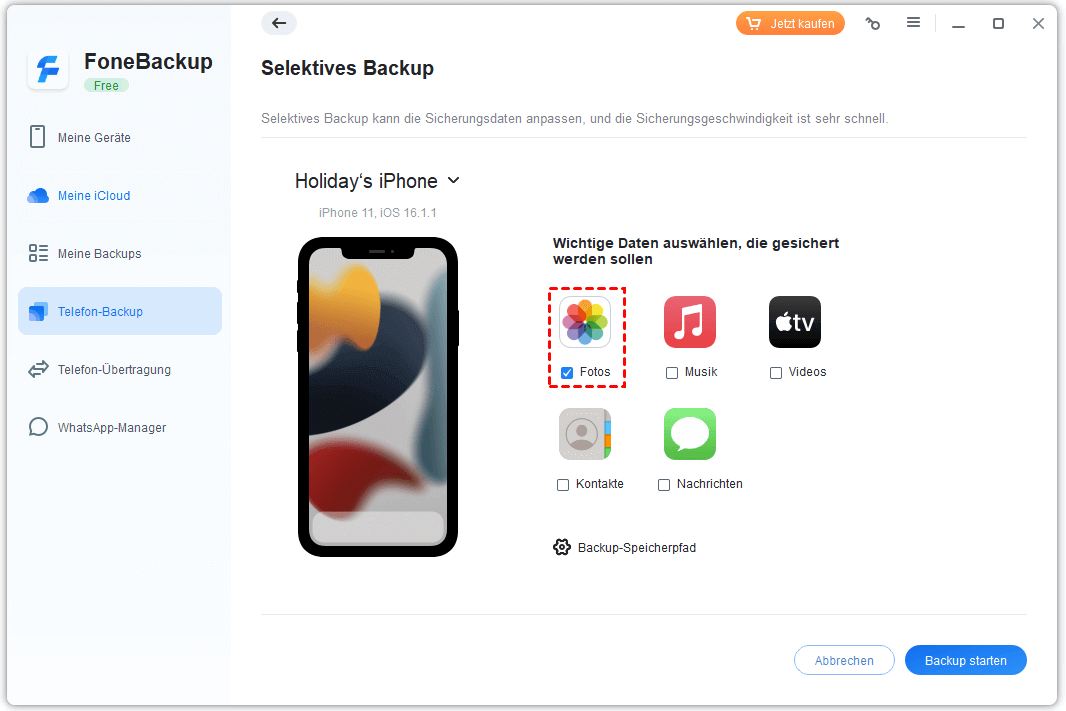 Schritt 1. Verbinden Sie das iPhone über ein USB-Kabel mit FoneBackup > Wählen Sie unter Telefon-Backup die Option Selektives Backup.