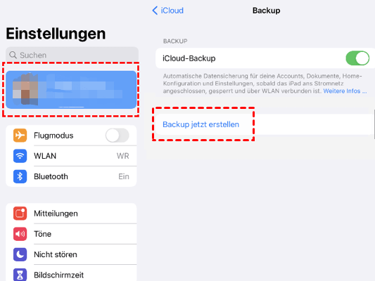 ● Alte iPad sichern: Gehen Sie zu Einstellungen > Tippen Sie auf Ihren Namen > iCloud > iCloud-Backup > Tippen Sie auf „Backup jetzt ertellen“, um ein Sicherungspaket zu erstellen.