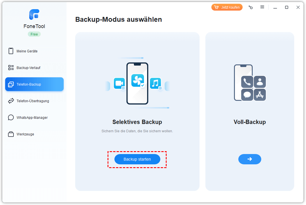 Schritt 1. Verbinden Sie Ihr iPhone über USB mit dem Computer > Starten Sie FoneTool > Klicken Sie auf Telefon-Backup und gehen zu Selektives Backup.
