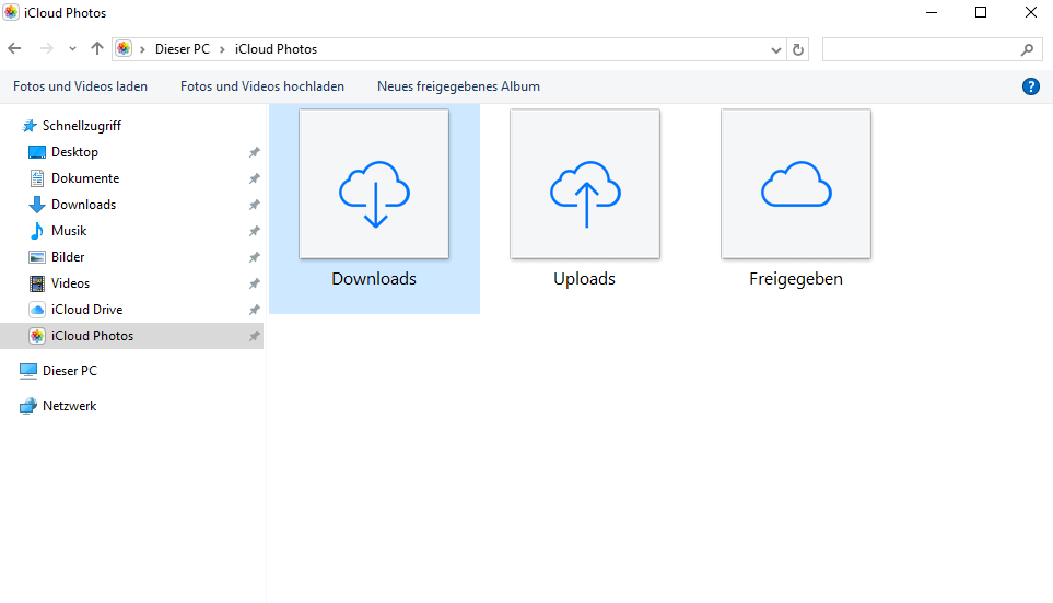 Schritt 4. Gehen Sie zum Windows-Datei-Explorer > Klicken Sie auf das Symbol „iCloud-Fotos“ > Klicken Sie auf „Downloads“, um Ihre iPhone-Fotos abzurufen.