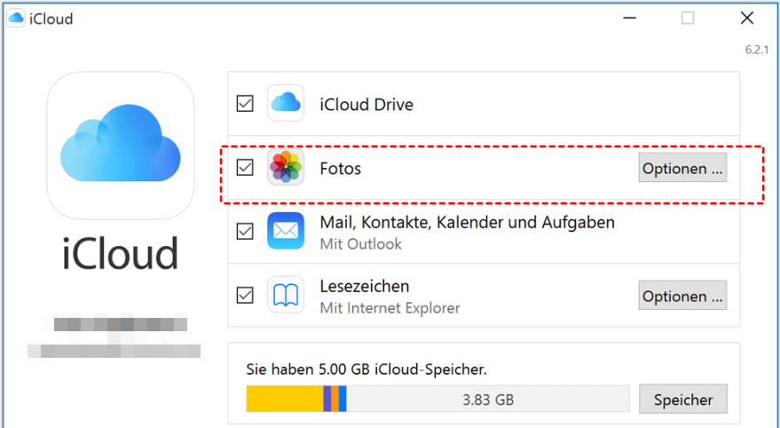 Schritt 2. Gehe zu iCloud > Überprüfe das Symbol Fotos > Klicke hinter dem Symbol Fotos auf Optionen.
