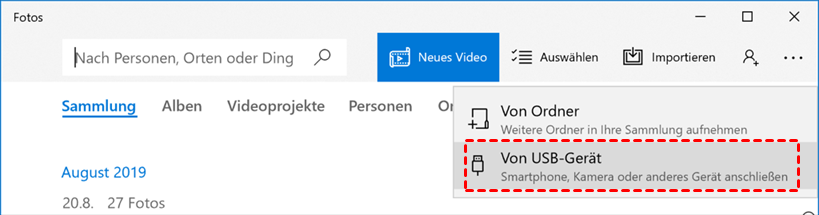 Schritt 2. Wenn Sie im Fenster Windows-Fotos aufgefordert werden, klicken Sie im Dropdown-Fenster auf Importieren > Wählen Sie Von USB-Gerät.
