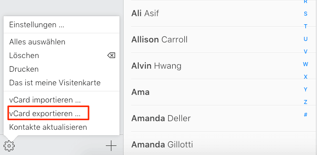 Schritt 4. Wählen Sie im sich öffnenden Menü „vCard exportieren“ und aktivieren Sie „In Datei speichern“. Wenn Sie mit „OK“ bestätigen, wird die Kontaktdatei als VCF-Datei im Downloads-Ordner auf Ihrem PC gespeichert.
