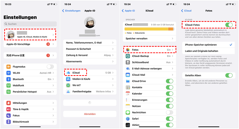 ✍ Hinweis: Stellen Sie sicher, dass Sie iCloud auf Ihrem iPhone, iPad, iPod Touch oder Mac eingerichtet und iCloud Fotos aktiviert haben. Gehen Sie zu Einstellungen auf dem iPhone > tippen Sie auf Profil > tippen Sie auf iCloud > Fotos > aktivieren Sie iCloud Fotos.