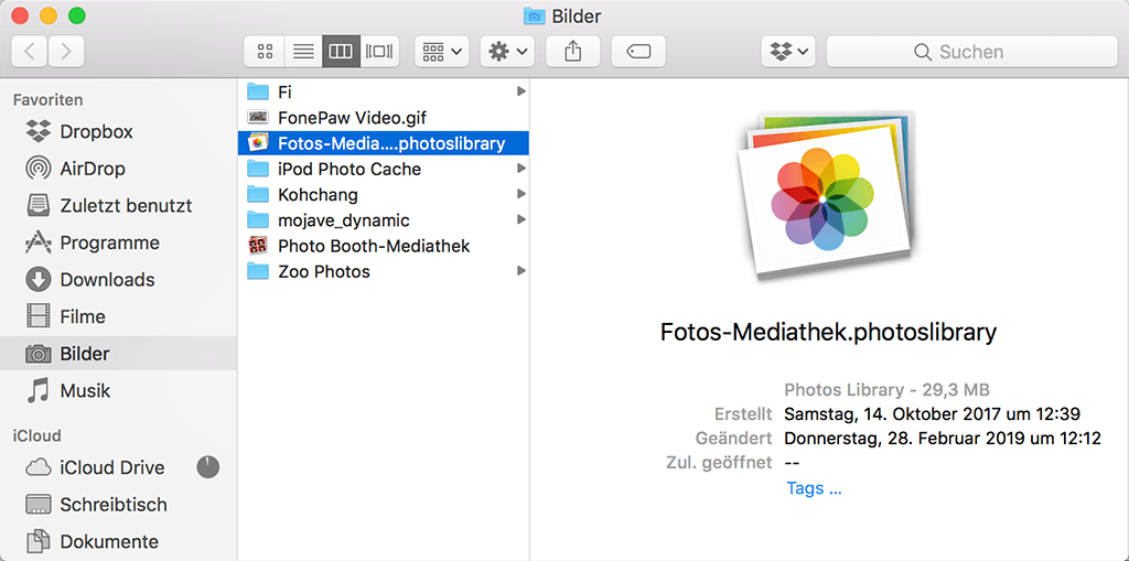 Schritt 4. Klicken Sie auf Allgemein und „Im Finder zeigen“, um die Fotomediathek auf dem Mac zu finden. Der Standardpfad: Benutzer>Ihr Name>Bilder>Fotomediathek.