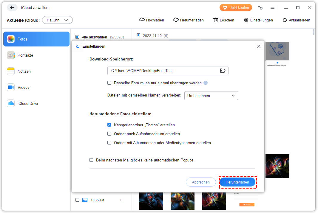 Wenn Sie iCloud-Fotos auf den PC herunterladen möchten, ist FoneBackup Ihr guter Helfer. Mit diesem All-in-One-Tool zur iCloud-Datenverwaltung können Sie iCloud/iCloud Drive ganz einfach auf den PC hochladen, herunterladen und löschen. Sie können sogar iCloud-Daten von einem iCloud-Konto auf ein anderes übertragen.