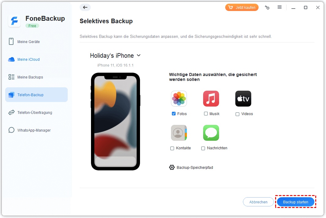 Schritt 2. Sie können das Funktionsfeld auf der linken Seite „Telefon-Backup“ > „Selektives Backup“ > „Backup starten“ auswählen.