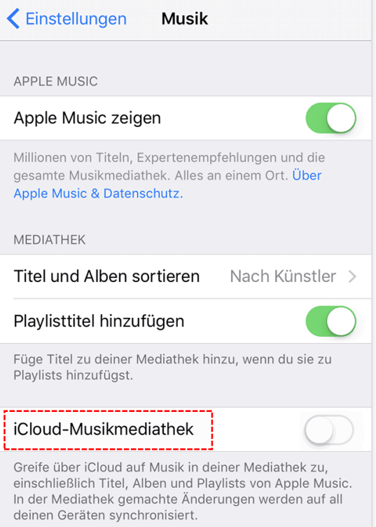Wie wir bereits gesagt haben, ist der Hauptgrund, dass die iCloud-Musikmediathek aktiviert ist. Um Musikdateien von iTunes mit dem iPhone zu synchronisieren, müssen Sie auf dem iPhone die iCloud Musikmediathek deaktivieren.