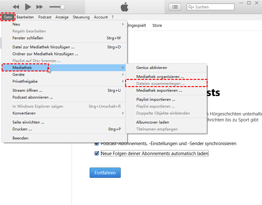 ? Hinweis: Wenn sich die Musik noch in Ihrer iTunes-Mediathek befindet, müssen Sie die Musikdateien in Ihr iTunes laden. Sie können in iTunes auf „Dateien“ > „Mediathek“ > „Dateien zusammenlegen“ klicken, damit alle Musikdateien in einen Ordner auf Ihrem Computer kopiert werden. Und dann finden Sie sie auf Ihrem Computer unter C:\Benutzer\IhrBenutzername\Musik\iTunes\iTunes Media. So können Sie Ihre Musik unter dem iTunes-Medienordner auswählen.