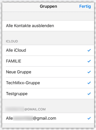 Öffnen Sie die App Kontakte > Tippen Sie oben rechts auf Gruppen > Deaktivieren Sie alle Konten von Drittanbietern > Wählen Sie Alle iCloud > Tippen Sie zur Bestätigung auf Fertig. Schalten Sie Ihr iPhone aus und wieder ein.
