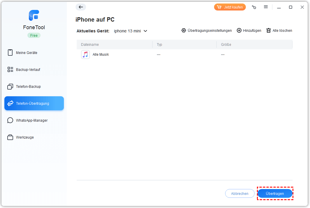 Wähle unter Telefon-Übertragung die Funktion iPhone auf PC > Tipp auf Übertragen.