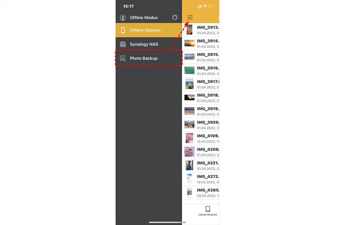 Schritt 2. Klicken Sie auf die drei Balken, um zum Menü zu gelangen, und klicken Sie auf „Photo Backup“ > Sie werden möglicherweise aufgefordert, sich erneut „anzumelden“ > Wählen Sie einen „Zielordner“auf Ihrer Synology.