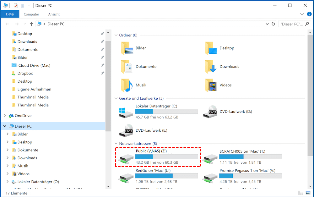 Schließlich wird ein Windows Explorer angezeigt. Ihr gemeinsamer Ordner wird unter „Dieser PC“ zugewiesen und ist zugänglich.