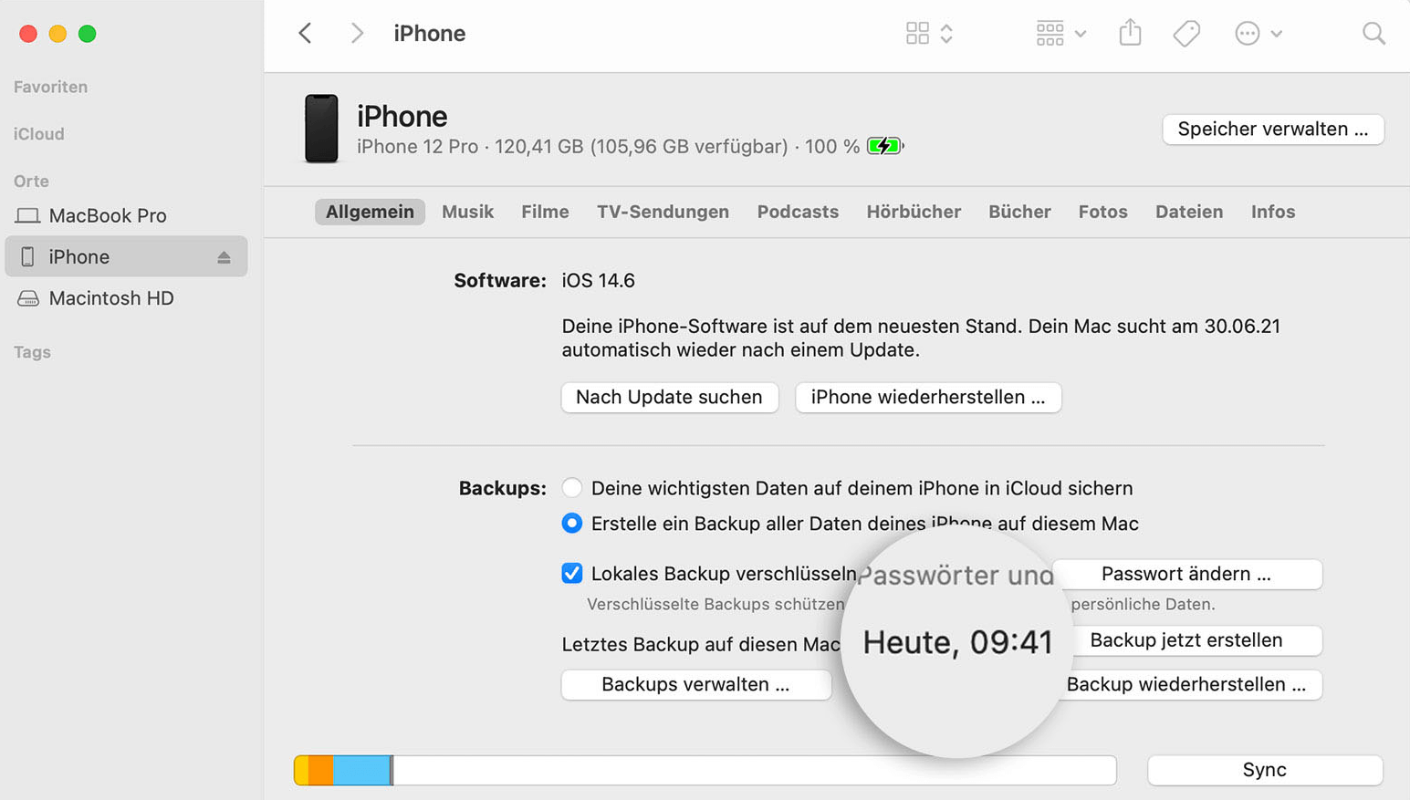 Ihr Backup kann immer noch nicht angezeigt werden. Beim iPhone Wiederherstellen mit dem Finder wird das iPhone zuerst gelöscht. Außer dem Ort, an dem das Backup erstellt wird, hat sich nichts geändert.