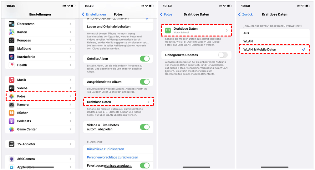 Schritte: Gehen Sie auf Ihrem iPhone und iPad zu „Einstellungen“ > scrollen Sie nach unten, um „Fotos“ zu finden > tippen Sie auf „Drahtlose Daten“ > klicken Sie auf „WLAN & Mobile Daten“.