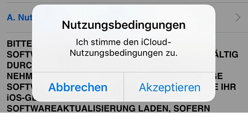 ✘ Neue Nutzungsbedingungen. Wenn neue Nutzungsbedingungen aktualisiert werden, kann Apple die Nutzung von iCloud blockieren, bis die neuen Bedingungen akzeptiert werden. Wenn Sie die Bedingungen noch nicht akzeptiert haben, können Sie unter diesen Umständen nicht auf den iCloud-Dienst auf dem iPhone zugreifen.