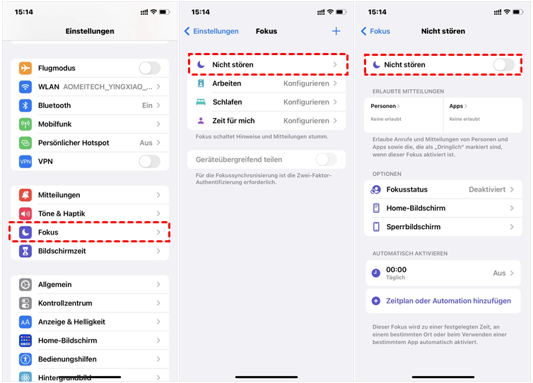 ● So deaktivieren Sie den Modus „Nicht stören“: Gehen Sie zu „Einstellungen“ > tippen Sie auf „Fokus“ > „Nicht stören“ > Schalten Sie die Option „Nicht stören“ aus.