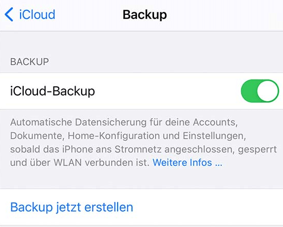3. Wähle iCloud > iCloud-Backup. Wenn es ausgeschaltet ist, aktiviere bitte es. Wenn dein iPhone eingesteckt, gesperrt und mit WLAN verbunden ist, wird die Datensicherung automatisch durchgeführt.