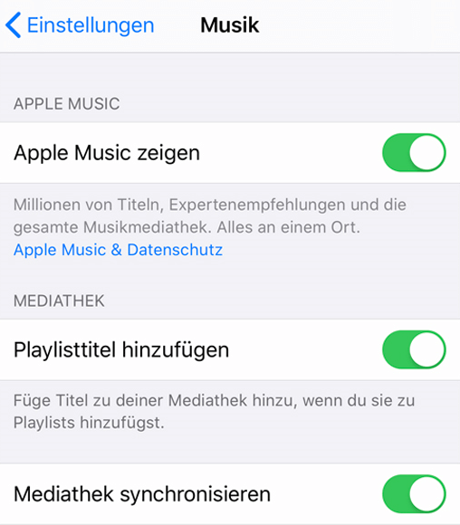 Wenn du Apple Music-Abonnent bist, aktiviere Mediathek synchronisieren, um iPhone-Musik zu sichern. Auf diese Weise kannst du auf alle deine Musiksammlungen auf all mit derselben Apple ID angemeldeten Geräten zugreifen, wie iPad, iPod, Mac oder PC.