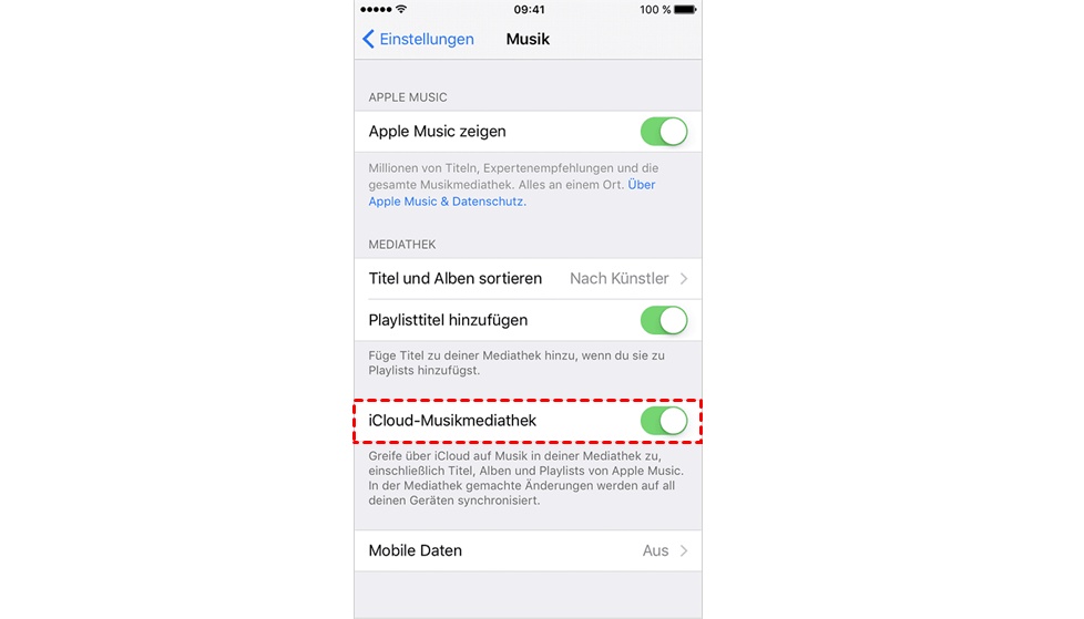 iCloud ist eine der Funktionen, mit der Sie Ihre Playlist auf Ihrem Gerät zugänglich machen können. Sie können die iCloud-Musikmediathek auf dem iPhone und in iTunes aktivieren, um Streaming-Musiktitel auf Ihrem Gerät zu synchronisieren, damit Playlist auf dem iPhone nicht in iTunes angezeigt werden.