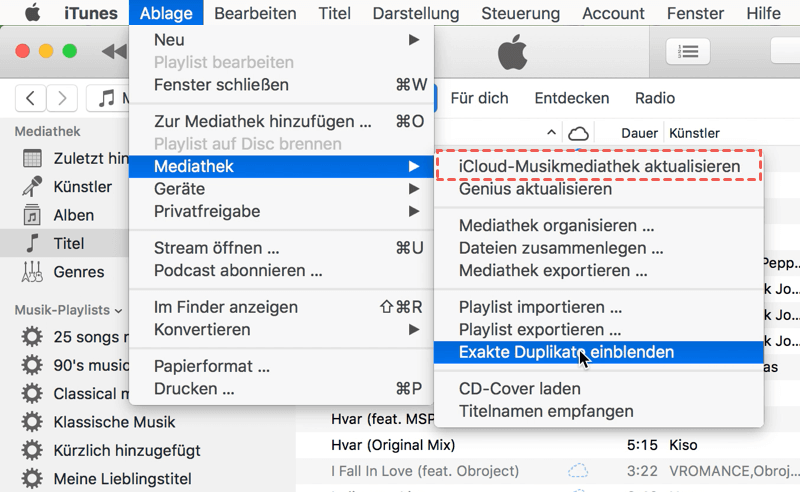 Schritte: Rufen Sie iTunes auf dem PC oder Mac auf > öffnen Sie „Datei“ > „Mediathek“ > tippen Sie auf „iCloud-Mediathek aktualisieren“.