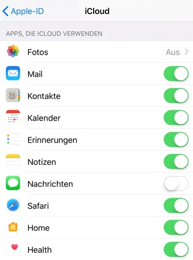 Gehen Sie auf dem iPhone zu: Einstellungen > [Ihr Name] > iCloud. Sie können die Funktionen und Schaltflächen sehen. Wenn Sie die Schaltfläche einschalten, bedeutet das, dass Sie die Daten in iCloud hochladen möchten und dann können Sie die Daten zwischen iPhone und iPad mit iCloud synchronisieren.