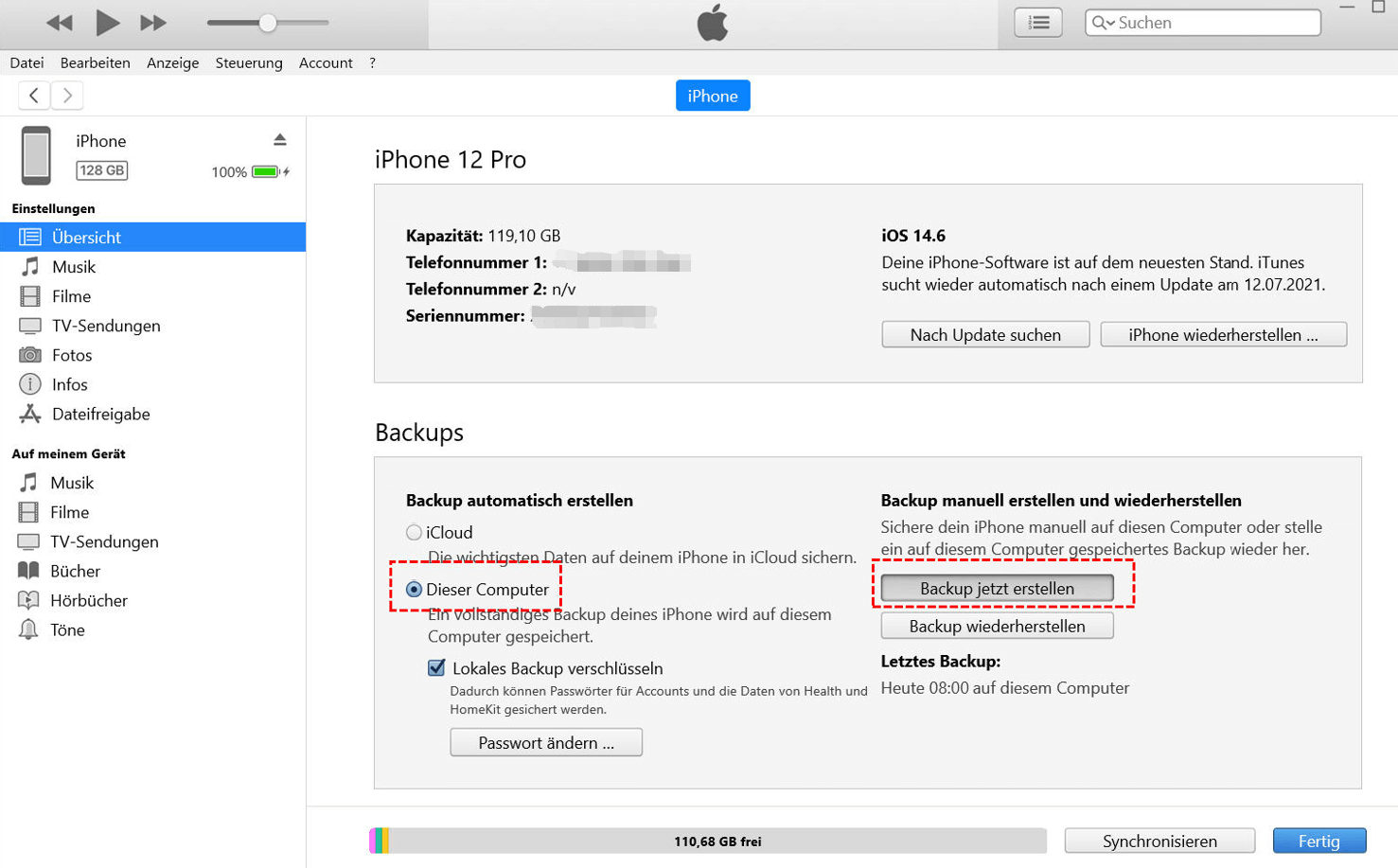 3. Klicken Sie auf Backup jetzt erstellen. Es dauert einige Minuten, bis Ihr iPhone gesichert ist > Trennen Sie danach das iPhone.