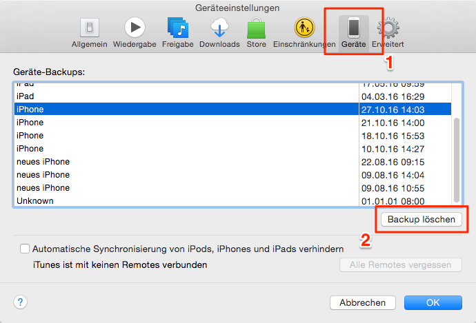Um die beschädigten Dateien zu löschen, können Sie die folgenden einfachen Schritte ausführen. Navigieren Sie in iTunes zum Menü iTunes > Geräteeinstellungen > Geräte. Wählen Sie die Sicherungsdateien aus und klicken Sie dann auf die Schaltfläche „Backup löschen“.