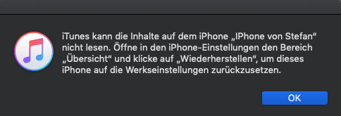 iTunes kann den Inhalt des iPhones nicht lesen. Ich versuche, mein iPhone zu sichern und auf einen neuen Computer zu aktualisieren, und es wird mir auch nicht erlaubt? Hat jemand eine Idee?