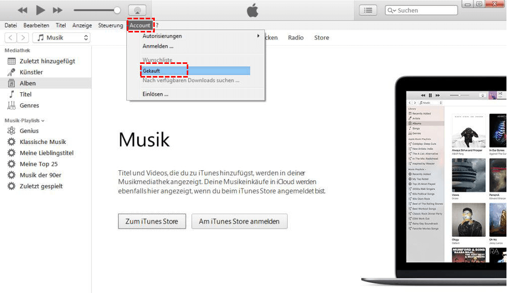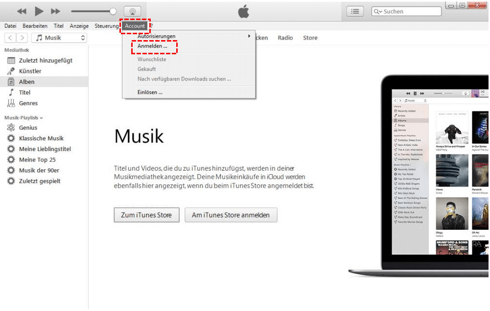 Schritt 1. Öffnen Sie iTunes. Klicken Sie auf Account, um sich mit Ihrer Apple-ID anzumelden. Sie sollten sich mit der richtigen ID anmelden, sonst können Sie Ihre gekauften Artikel nicht finden.