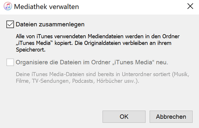 Schritt 4. Klicken Sie auf: Datei > Mediathek > Mediathek verwalten > Dateien zusammenlegen. In diesem Schritt werden die Mediendateien, die sich nicht am Standardspeicherort befinden, in den Ordner kopiert, um sicherzustellen, dass Sie die gesamte iTunes-Mediathek in einem Ordner unterbringen können.