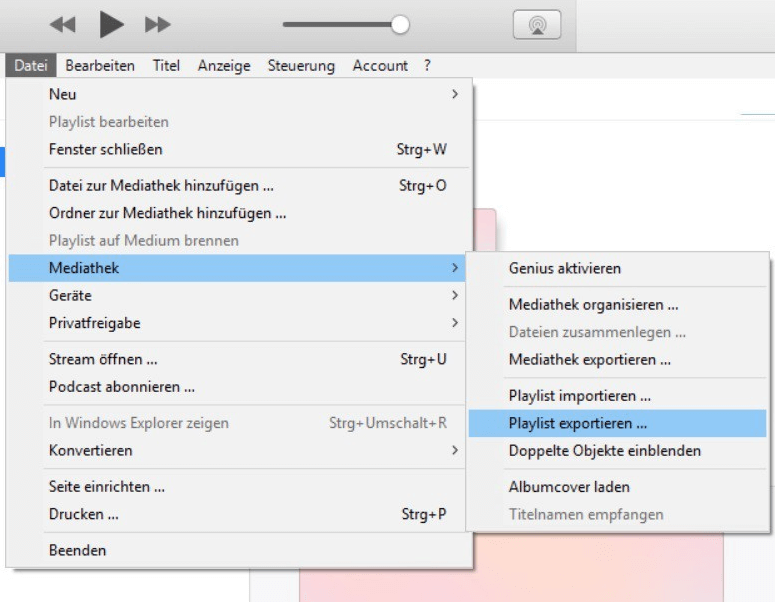2. Klicken Sie im oberen Menü auf: „Datei“ > „Mediathek“ > „Playlist exportieren“, um die Wiedergabeliste als XML-Dateien auf diesem Computer zu speichern.