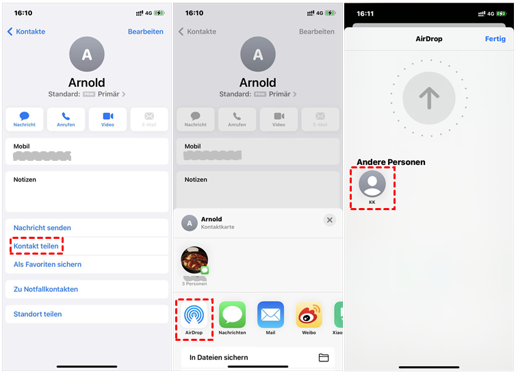 Schritt 2. Tippen Sie auf die Option „Kontakt teilen“ > Tippen Sie auf „AirDrop“ > Wählen Sie das Ziel-iPhone aus.