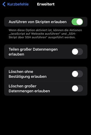 Schritt 1. Gehen Sie auf dem iPhone zu Einstellungen > Suchen Sie nach und tippen auf Kurzbefehle > Tippen Sie auf Erweitert >Schalten Sie den Schalter Ausführen von Skripten erlauben aus.