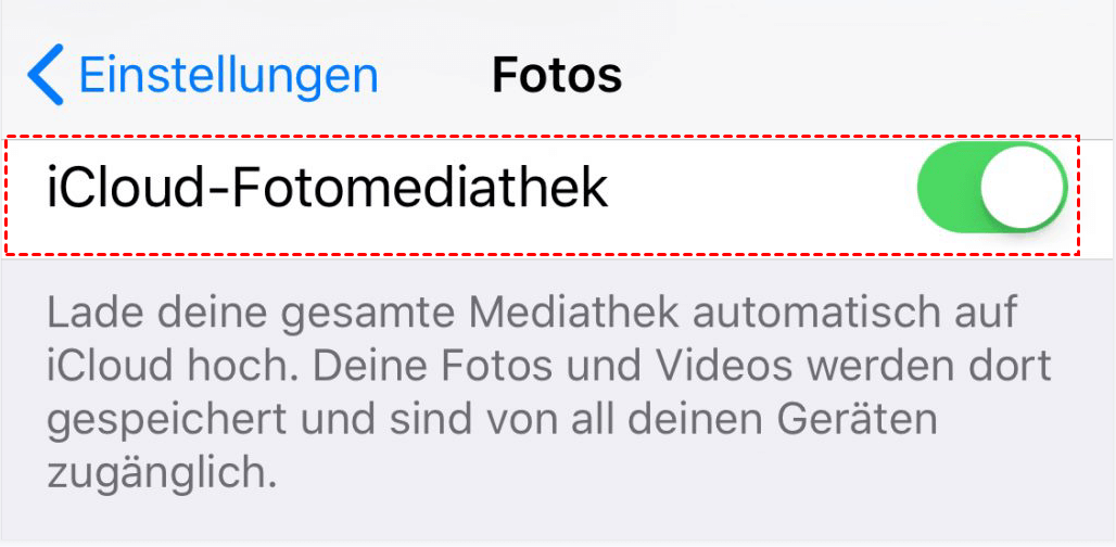 Schritt 1. Gehen Sie zum iPhone: Einstellungen > Apple-ID> iCloud > Fotos. Und aktivieren Sie die iCloud-Fotomediathek. Dann werden alle Fotos und Videos einschließlich Live-Fotos in iCloud hochgeladen.